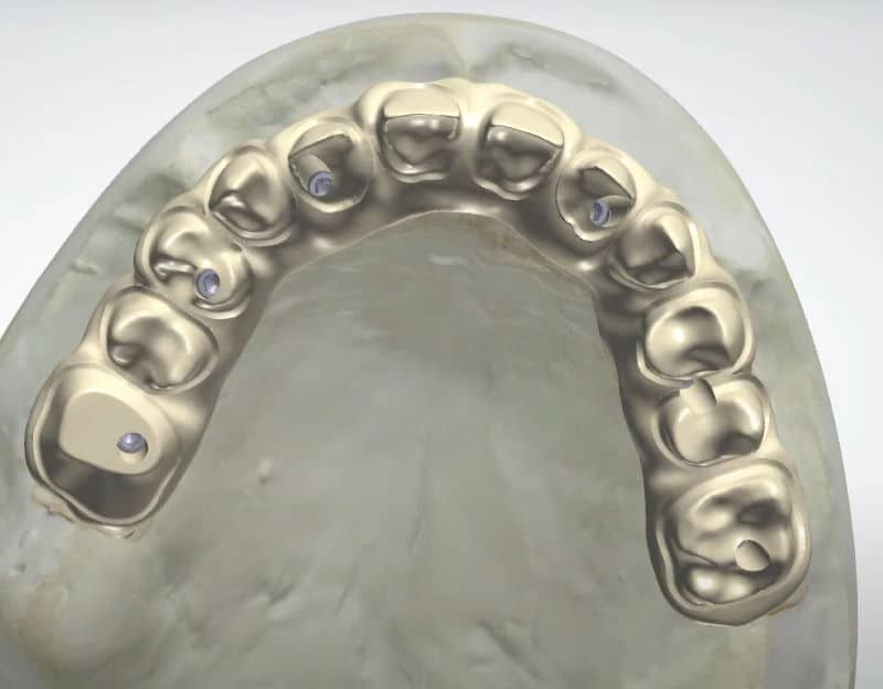 - Thimble Bar (Split Design): We design a substructure (Metal/Trinia/Zirconia) with individual “thimbles” and a superstructure of individual crowns or veneer. This mimics natural teeth and prevents full-arch stress fractures.